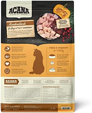 With ACANA Cat Food, we always go beyond the first ingredient. Each bag of ACANA Meadowland recipe cat food is thoughtfully crafted from start to finish in our award-winning Kitchen using fresh free-run chicken and turkey, meaning our chicken and turkey move freely in a barn and are never housed in cages, freshwater fish, and cage-free eggs as the first three ingredients. These high-protein ingredients are balanced with key vitamins and minerals like taurine, omega fatty acids, and high-quality proteins. Our fresh ingredients use refrigeration as the sole method of preservation and our raw ingredients are frozen at their peak freshness to ensure quality in every bag of ACANA Cat Food.