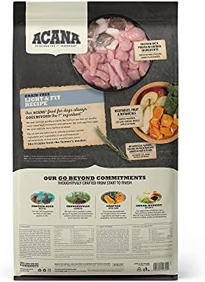 With ACANA Dog food, we always go beyond the first ingredient. Each bag of ACANA Light and Fit recipe dog food is thoughtfully crafted from start to finish in our award-winning Kitchen using fresh free-run chicken and turkey and cage-free eggs, meaning our chicken and turkey move freely in a barn and are never housed in cages. These high-protein ingredients are balanced with vegetables, fruit and botanicals delivered daily, so that every meal for your pet is like it came from the farmer’s market. Our fresh ingredients use refrigeration as the sole method of preservation and our raw ingredients are frozen at their peak freshness to ensure quality in every bag of ACANA Dog Food.