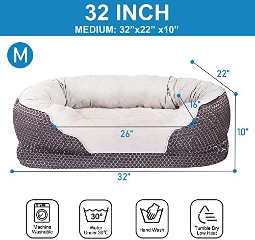 【Medium DOG BED】: Measuring from outside of bolster 32″x 22″. Sleeping area inside bolster: 26″x 16″. Ideal for Small to Medium size pets. Can easily hold up to 50 lbs and fitted for pets up to 26″ in length