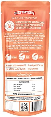 Beefeaters lickables puree cat treats are made with the finest ingredients, they can be mixed with food, used as a topper or given as a separate treat. Provide as a treat to your cat. Always supervise your cat when treating. Be sure to provide fresh, clean water. Intended for cats only. Keep out of reach of children.