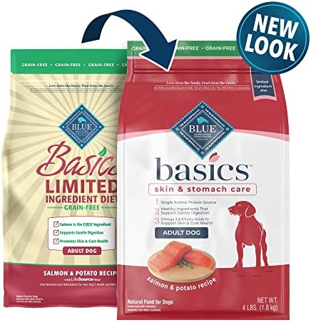 Contains one (1) 4lb bag of BLUE Basics Skin & Stomach Care, Grain Free Natural Adult Dry Dog Food, Salmon & Potato