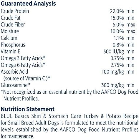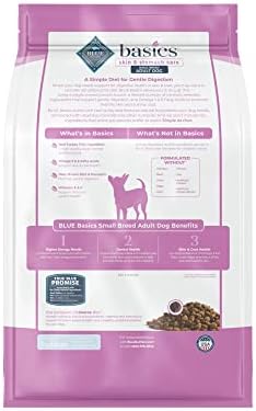 LIMITED INGREDIENT DOG FOOD: BLUE Basics doesnโt contain any chicken, beef, corn, wheat, soy, dairy or eggs making it a good option for dogs with food sensitivities; It’s small bite kibble and balance of carbohydrates and protein meet small breed’s needs