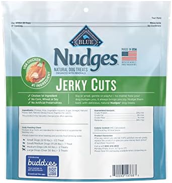 PACKAGING MAY VARY: Contains one (1) 16oz bag of BLUE Nudges Jerky Cuts Natural Dog Treats, Chicken