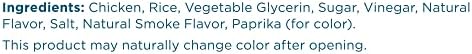 Chicken, Rice, Vegetable Glycerin, Sugar, Vinegar, Natural Flavor, Salt, Natural Smoke Flavor, Paprika (for color)
