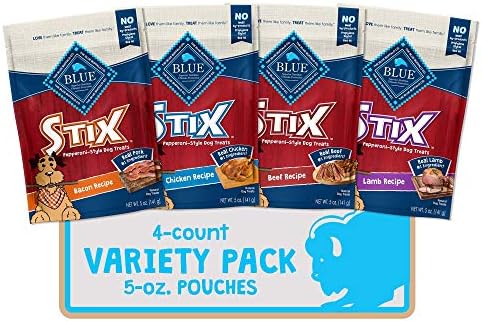 Contains four (4) 5-oz bags of BLUE Stix Natural Soft-Moist Dog Treats, Beef Recipe, Bacon Recipe, Lamb Recipe and Chicken Recipe.