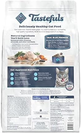 Formulated to support the health and well-being of indoor felines, this BLUE Tastefuls recipe features the finest natural ingredients plus vitamins and minerals, starting with real deboned chicken. This deliciously healthy dry cat food is also packed with healthy whole grains and vegetables for a balanced meal your cat is sure to love.