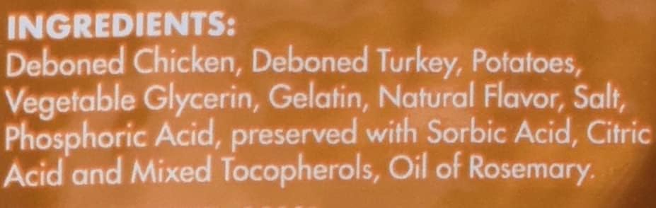 Deboned Chicken, Deboned Turkey, Potatoes, Vegetable Glycerin, Gelatin, Natural Flavor, Salt, preserved with Phosphoric Acid, Sorbic Acid, Citric Acid and Mixed Tocopherols, Oil of Rosemary.