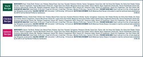 Contains one (1) Variety Pack of BLUE Wilderness High Protein Grain Free, Natural Adult Pate Wet Cat Food, Chicken, Salmon, Duck 3-oz (12 count- 4 of each flavor)