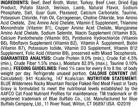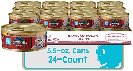 Contains twenty four (24) 5.5-oz cans of BLUE Wilderness Rocky Mountain Recipe High Protein Grain Free, Natural Adult Flaked Wet Cat Food, Red Meat in Tasty Gravy
