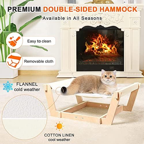 🐱COMFORT FABRIC – The raised cat hammock’s premium reversible pad for all seasons, sherpa cashmere for colder weather, and cotton linen for warmer weather are soft, comfortable and breathable, perfect for snuggling and lounging.