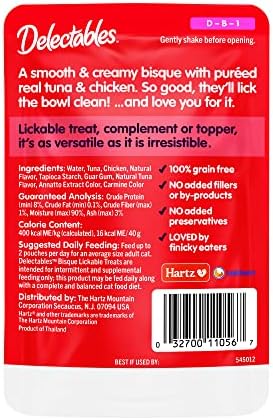 Searching for a treat your favorite feline canβt resist? Look no further. Delectable is the first gourmet lockable treat to combine tender, real chicken and succulent, plump fish in three purr worthy textures: Bisque (smooth), Stew (hearty) and Chowder (creamy). each recipe boasts nutritious and flavorful ingredients delectably blended for easy-to-lap eating with items for kitten, adult, and senior life stages. The unique consistency, combined with our superior palatability technology, makes delectable lockable treats so delicious cats lick the bowl clean! The perfectly sized 1.4 ounce Pouch is easy to open and pour for a quick snack or food topper to entice finicky eaters.