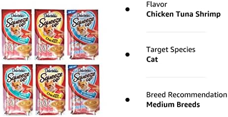 This cat treats flavor variety pack includes 3 flavors of Delectables Squeeze Up snacks for cats (Tuna, Chicken, and Tuna & Shrimp). This set includes 2 flavor pouches of each flavor, for a total of 6 flavor pouches (2.0 oz each). Each flavor pouch is 2.0 ounces and contains 4 tubes of puree treat (0.5 ounces per tube). Recommended feeding for average size adult cat: can feed up to 3 tubes per day