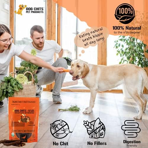 ๐Ÿ•100% ORGANIC INGREDIENTS โ€“ We donโ€™t mess around here at Dog Chits, we use organic turkey, chicken, sweet potato and apple cider vinegar which helps reduce the inflammation in the body and supports the immune system.