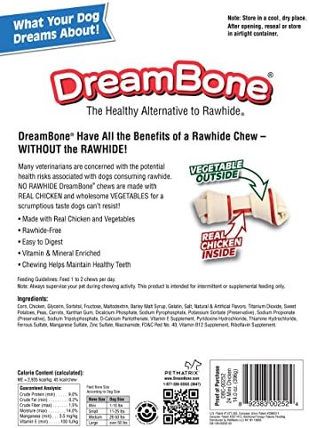 DreamBone chews have all the benefits of a rawhide chew without the rawhide. No-rawhide DreamBone chews are made with real chicken, beef, bacon and cheese or sweet potato and wholesome vegetables for a scrumptious taste dogs canβt resist! No-rawhide DreamBone Mini Chews for dogs are made with real chicken and wholesome vegetables for an irresistible taste dogs dream about. Enriched with vitamins and minerals, these chews are a healthy alternative to rawhide. Treat your small or toy-sized pup to these highly digestible and 100 percent delicious mini chews. DreamBone Mini Chews promote healthy teeth and gums through the natural action of chewing, making them a treat both you and your dog can love. Give your dog 1 to 2 DreamBone Mini Chews per day. Always supervise your pup during chewing activity and provide access to fresh, clean water. These chews are intended for intermittent or supplemental feeding only. Store in a cool, dry place. After opening, reseal or store in an airtight container to preserve freshness.The experts at DreamBone brand want you to have healthy, happy dogs. We know that your dog is more than a pet β theyβre family. Chewing is an essential, healthy and enjoyable activity for dogs.