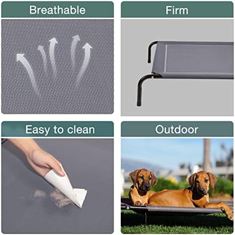 Product Details – Large raised dog cot bed measures 49”L x 35.5”W x 8”H (Frame) and 43”L x 35”W (Mesh) for dogs up to 85 lbs. Friendly Reminder: We are having a quick upgrade on the mesh. During this period, please understand that you may receive either grey or black mesh.