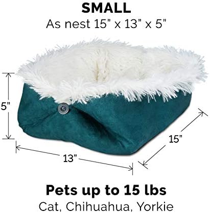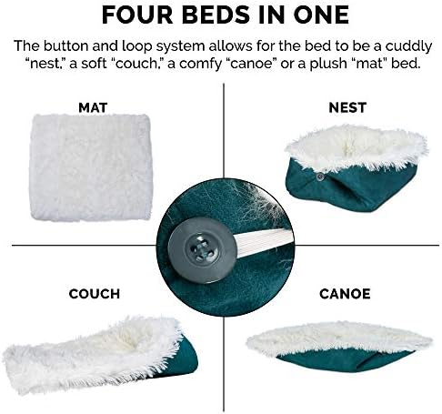 Fluffy, fun and foldable, the Furhaven Self-Warming Long Faux Fur & Suede Convertible Cuddler Cat Bed is four beds in one. Featuring a simple system of buttons and elastic loops, you can configure the bed to be a cuddly “nest,” a soft “couch,” a comfy “canoe” or a plush “mat” bed. Whichever way you choose, your pet will enjoy the cozy comfort of the bed’s self-warming core. Insulating fabric with a soft, reflective surface sends your pet’s natural body heat back to create a luxuriously warm sleep experience. Deep, faux fur fabric sleep panel is soft on paws and noses. Suedine fabric is a lustrous base (or exterior) and can also be used as an alternate sleep panel for warmer days. This soft design bends to any shape like a lovely, fuzzy blanket and is fully machine washable. NOT SUITABLE for pets with excessive teething or chewing behavior as product contains small parts that may pose as choking hazards.