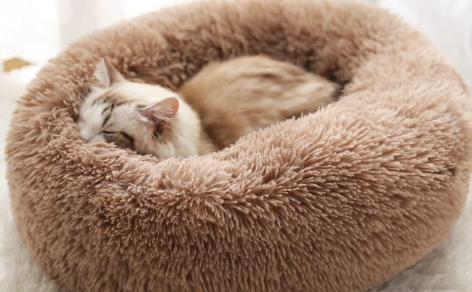 Geizire Cat Beds for Indoor Cats/Dog Beds for Small Dogs, Washable Donut Calming Round Cat Bed, Soft Fluffy Warm and Cozy Anti Anxiety Cuddler Cat Bed, Joint-Relief Cat Bed (Medium, Brown)