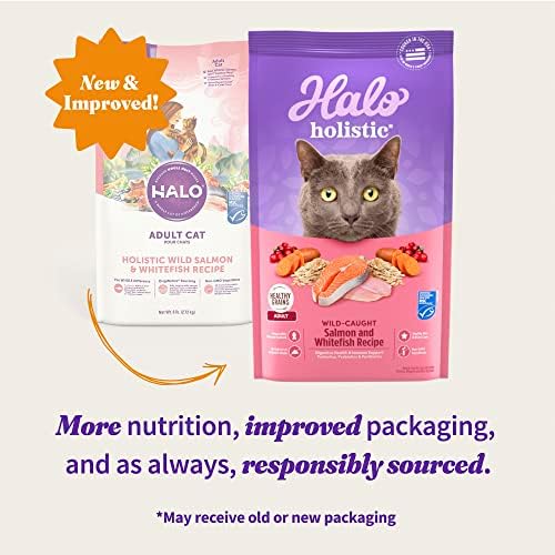 Cat moms, we know you want to feed your furry child the best. Start with Halo Holistic Wild-caught Salmon and Whitefish Recipe dry cat food, our holistic cat food recipe is made with whole, certified salmon as the first ingredient. With a delicious flavor and kid-approved aroma, this meal offers high-quality protein to give them a boost of energy and help support muscle maintenance. This natural cat food dry recipe has added vitamins, minerals and nutrients to help provide complete nutrition for adult cats. Every serving of Halo cat kibble is loaded with prebiotics and probiotics for cats, plus postbiotics to support digestion. Our cat digestive health recipe has optimal levels of omega fatty acids for healthy skin and a radiant coat. The ultra-premium cat food recipes are cooked in the USA and use only real, whole, easy-to-digest protein and no meat meal of any kind. Halo dry cat food salmon and whitefish recipe is clean nutrition you can trust. Wondering how much to feed them? We’ve got you covered. Just refer to the recommendations on adult cat food bag.