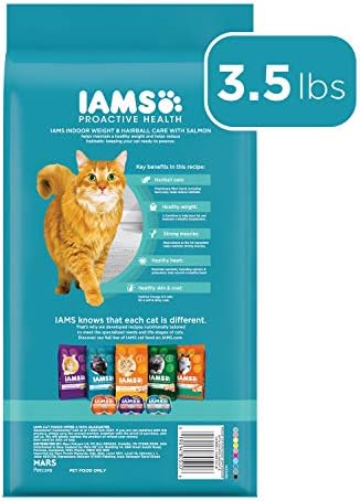 Your cat is uniqueβ¦ thatβs why IAMS makes a cat food thatβs just as unique as they are. Help keep your cats at their best with IAMS PROACTIVE HEALTH Adult Indoor Weight & Hairball Care Dry Cat Food with Salmon. This kibble recipe is designed to provide your cat with the nutrients they need and assist with weight management and hairball control. Help your cat sustain a healthy weight with this unique formula, without the loss of flavor. Made with L-carnitine, it helps burn fat and maintain a healthy metabolism. It features a proprietary fiber blend including beet pulp that can help control hairballs. This cat food formula contains the optimal omega 6:3 fatty acid ratio to help your kitty grow and maintain a soft, shiny coat, with real salmon as the first ingredient. This formula is full of essential vitamins and nutrients, including vitamin E to help maintain a strong immune system. Plus, it nourishes heart health with calcium and potassium. Your cat will be eager to get their paws on this purr-fect fish cat food formula, and you can rest easy knowing youβre feeding them a meal that contributes to healthy nutrition.