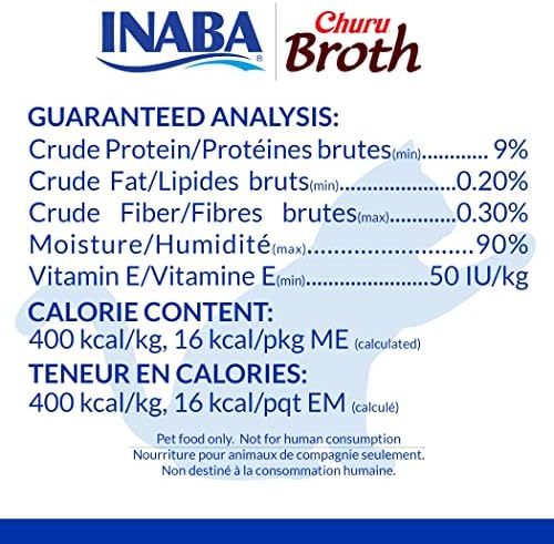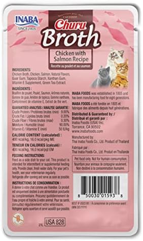 Here at Inaba, we know that your cat is a beloved member of your family. That’s why our Churu Broth Topper/Treats for Cats start with silky chicken broth made from 100% natural farm-raised chickens and contain no grains, preservatives or artificial colors. Each pouch contains a healthy serving of chicken broth mixed with succulent flakes of chicken, plus tuna, scallop, or salmon- giving your kitty four mouthwatering flavors to choose. With Vitamin E (an essential nutrient that helps support your cat’s immune system), 90% moisture to help aid with feline hydration and 16 kcal per pouch, these are a healthy low calorie treat you can feel good about feeding your cat. Perfect for all ages- kitten to senior, simply tear open the pouch and pour out the delicious mix of broth and flaky meat. Use as a side dish, complement to a meal, wet/dry cat food topper or as a special treat, your kitties will thank you from the bottom of their paws. Inaba makes snack time fun for you and your cats.