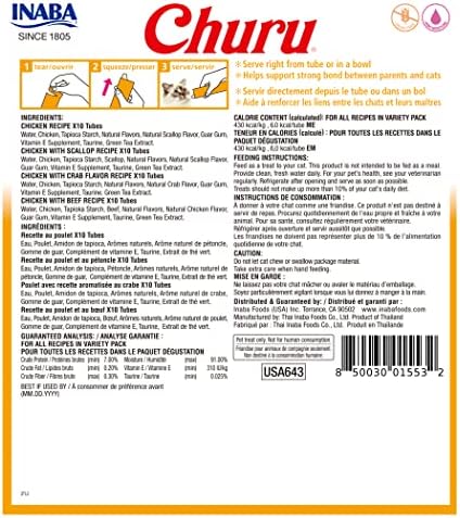 KEEP YOUR FELINE HYDRATED WITHOUT ADDING CALORIES: Each delicious, creamy Churu tube contains 91% moisture and only 6 calories (a tenth of the calories of traditional dry cat treats), which makes it a healthy snack you can feel good about feeding