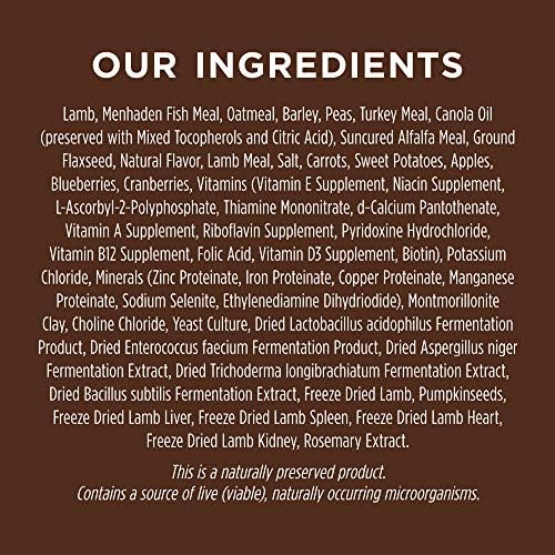 Natural nutrition begins here. Instinct Be Natural Real Lamb & Oatmeal Recipe starts with grass-fed lamb and never contains filler, corn, wheat, soy or by-product meals or artificial preservatives and colors. Guided by our belief in the power of raw, each piece is tumbled with crushed freeze-dried raw lamb – raising the bar in nutrition and taste.