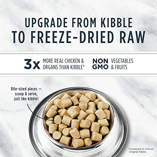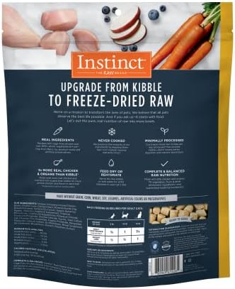 Upgrade your cat’s bowl from kibble to freeze-dried raw. Each Instinct Raw Freeze-Dried Meals recipe is protein packed with 93% meat & organs and 7% non-GMO fruits, vegetables; vitamins & minerals. Made without grain, corn, wheat, soy, legumes, artificial colors or preservatives.