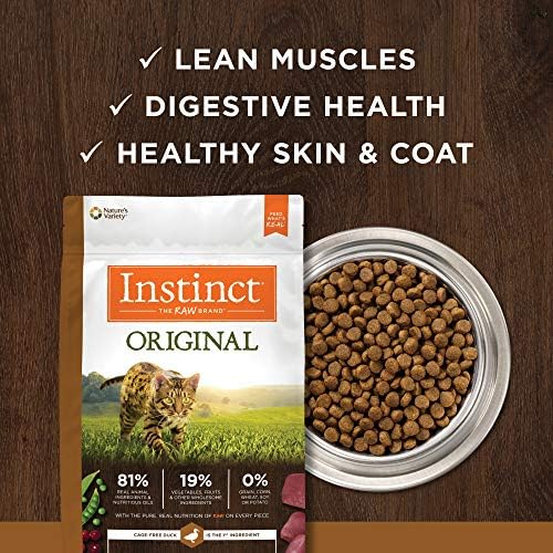 NATURAL CAT FOOD: Instinct Original dry cat food is high protein cat food made with probiotics to support healthy digestion and omegas for skin & coat. Made without grain, potato, corn, wheat, soy, by-product meals, artificial colors or preservatives.