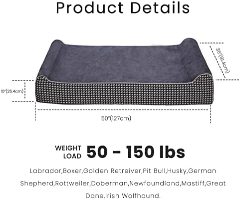 King Size 50″L x 36″W x 10″H Dimensions for dogs 50-150 lbs and under. The Laifug foam bed will become your pet’s favorite sleeping spot