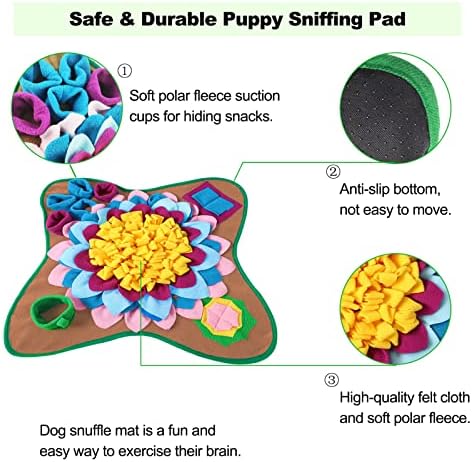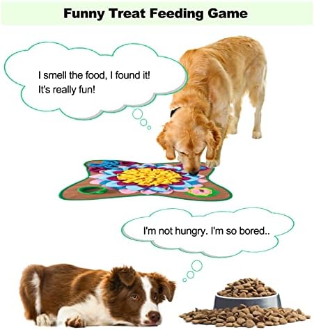 【Funny Treat Feeding Game】In the middle of the snuffle mat dog puzzle toys is a large flower with a mixture of yellow, red, and blue colors, which can easily hide large pieces of food and dog snacks.The rich and messy grass on the outer ring of the enrichment mat for dogs is suitable for small sized foods.The large snuffle mat for dogs also includes 5 small cups+1 large cup to control the dog’s feeding speed.