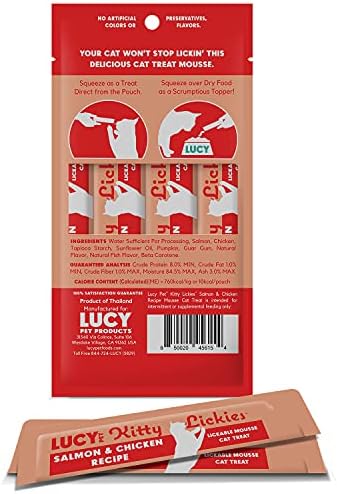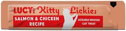 Kitty LIckies are scrumptious lickable mousse cat treats and food toppers. Your cat will enjoy Kitty Lickies directly from the pouch or you can squeeze over dry food for an extra special treat! Each 2 oz (56.7 g) packet contains 4-0.5 oz (14.2g) individual pouches for your cat to enjoy. No Artificial Colors, flavors, or preservatives.
