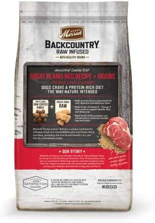 Merrick Backcountry Raw Infused Dry Dog Food Great Plains Red Recipe With Healthy Grains is an ancestral canine diet with the protein-rich ingredients dogs crave. This freeze dried dog food raw infused recipe provides dogs with the nutritional benefits of a raw dog food they would have discovered in the wild in a safe and convenient high protein dog food that’s easy to serve. Real deboned beef is always the first ingredient in this natural dog food. Lamb and rabbit are blended in, crafting a high protein dog food with the taste dogs go wild for. Merrick Backcountry dog food offers a unique combination of freeze-dried raw-coated kibble plus real freeze dried raw dog food bites, for a dry dog food with grains that helps build and maintain muscle tissue and energy levels. This healthy dog food dry recipe is made without peas or lentils and features whole grains to help support healthy digestion. Merrick dog food recipes are crafted in our Hereford, TX kitchen and cooked in the USA.