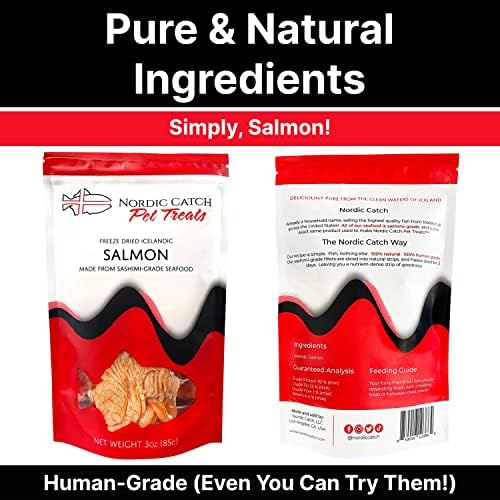 PURE & NATURAL INGREDIENTS: Nordic Catch Freeze Dried Pet Treats are made from whole ingredients without fillers, colorants or preservatives, in fact, they are purely fish! We use top quality, sashimi grade filets and freeze dry them for two days. Choose from our Icelandic Salmon or White Fish which contains Icelandic Cod, Haddock and Wolffish. Each strip of fish is packed with protein and omega-3 fatty acids. These treats are made of human grade ingredients, so even you can try them!