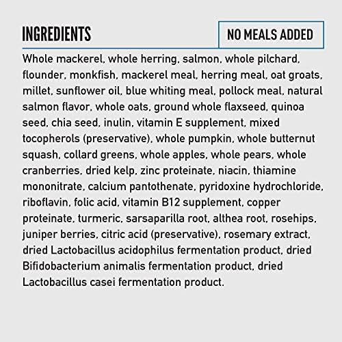The first 5 ingredients are ALWAYS fresh or raw animal protein. 90%* quality fish ingredients, providing a strong source of essential protein, vitamins, and minerals to help support muscle maintenance.