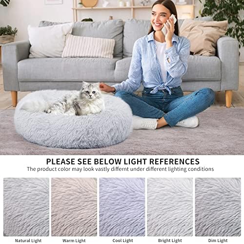 PEOPLE&PETS Soft Long Plush Pet Bed, Calming Self-Warming Round Donut Cuddler, Fluffy Dog Cat Cushion Bed with Anti-Slip & Waterproof Bottom(24″, Light Grey)