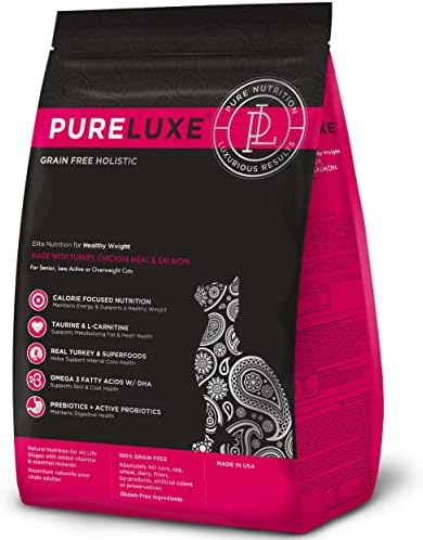 PURELUXE Grain and Gluten Free Cat Food, Healthy Weight Elite Nutrition, Turkey, Chicken, Salmon, for Senior, Less Active, Overweight Cats, All Life Stages and Breeds, Made in The USA, 3.3lbs