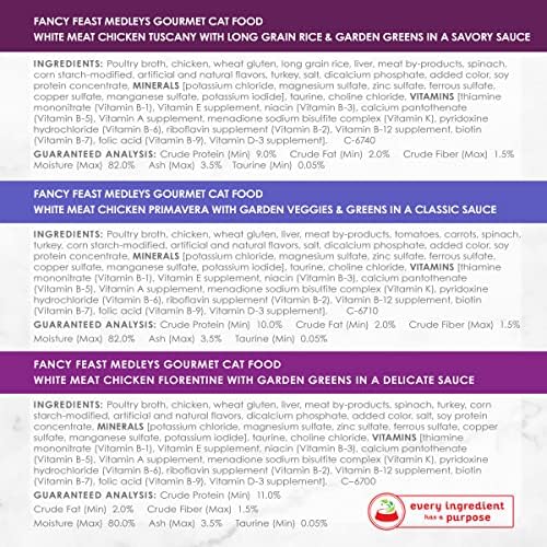 Feed your adult cat the inspired culinary combination of real white meat chicken, long grain rice, garden greens and veggies covered in a delicious, delicate sauce when you open a can of Purina Fancy Feast Medleys White Meat Chicken Recipe Variety Collection wet cat food. Created with discerning cats in mind, this exceptional, high-quality cat food has the tasty texture cats love and an artful blend of ingredients that keeps them coming back for more. The difference is in the details when you dish out this pet-pleasing concoction destined to become a daily favorite. Each easy-to-open can offers 100 percent complete and balanced nutrition for adult cats. Watch your favorite feline lick her lips when you peel back the convenient pull-tab top. Choose from Chicken Florentine, Tuscany or Primavera blends to keep even a picky eater on top of her game as you do your best to satisfy your cat and give her what she needs.