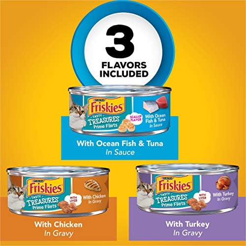 Keep your curious feline interested in mealtime by rotating the scrumptious recipes this Purina Friskies Tasty Treasures wet cat food variety pack. With three different recipes in each package that give her the classic poultry and delicious seafood flavors she loves, it’s easy to turn everyday meals into extraordinary taste adventures. The tender, shredded bites offer a palate-pleasing texture, and each entree is covered in a savory gravy or sauce that’s sure to have your content cat licking her dish clean. Because each recipe is formulated to deliver 100 percent complete and balanced nutrition for adult cats, this wet cat food helps support her overall wellness while providing the tastes she loves. Fill her dish with a different variety of this yummy and nutritious Friskies canned cat food created by Purina at each feeding, and watch as she delights in every delicious bite.