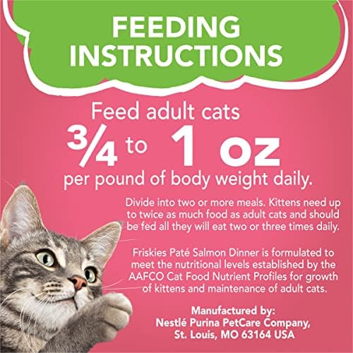 Sate your cat’s desires for savory seafood with Purina Friskies Pate Salmon Dinner wet cat food. The salmon flavor delivers the taste cats love, while the smooth pate texture gives her a tender, palate-pleasing reason to savor every mouthwatering morsel in her dish. Open a pull-tab can, and let the enticing aroma of this Friskies cat food lure her to you at mealtime. Every serving of this Purina cat food offers 100 percent complete and balanced nutrition for the growth of kittens and maintenance of adult cats, so this wet cat food can follow your darling cat through every stage of her happy life with you. With so much yummy goodness packed into every bite, this Purina Friskies Pate Salmon Dinner wet cat food is sure to be a favorite in your cat’s diet. Fill her dish at mealtime with this canned wet cat food every day, and show her that you pay close attention to what most excites her taste buds.
