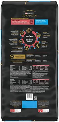 Choose nutrition that performs when you support your dog’s health with Purina Pro Plan Large Breed Sensitive Skin and Stomach Salmon and Rice adult dry dog food. With real salmon as the first ingredient, this high protein dog food delivers a savory flavor. Oat meal is gentle on his digestive system, while antioxidants help support a healthy immune system. Our premium large breed dog food also includes glucosamine and EPA, an omega-3 fatty acid, for joint health and mobility. Sunflower oil, a rich source of omega-6 fatty acids, supports his skin and coat. We fortify this sensitive stomach dog food with guaranteed live probiotics for digestive and immune health and include natural prebiotic fiber to nourish specific intestinal bacteria. It’s wheat and soy free and made without artificial colors or flavors to meet your preferences. Deliver 100 percent complete and balanced nutrition to your large adult dog with Purina Pro Plan Large Breed Sensitive Skin and Stomach Salmon and Rice adult dry dog food.