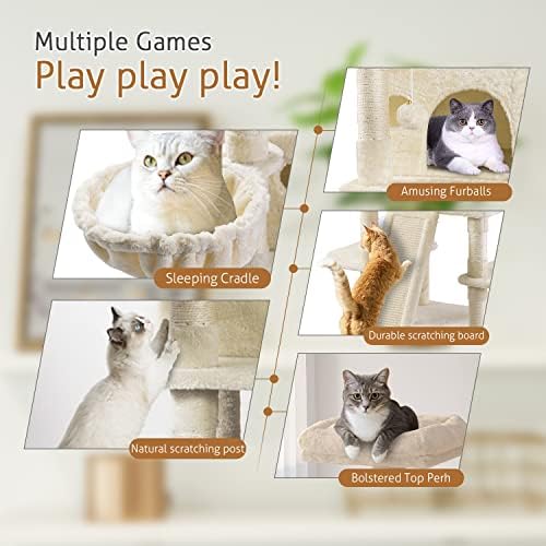 Solid and Stable:Cat tree is made of high quality particle board with skin-friendly plush covering,strengthened base is strong enough to support 44 lb.