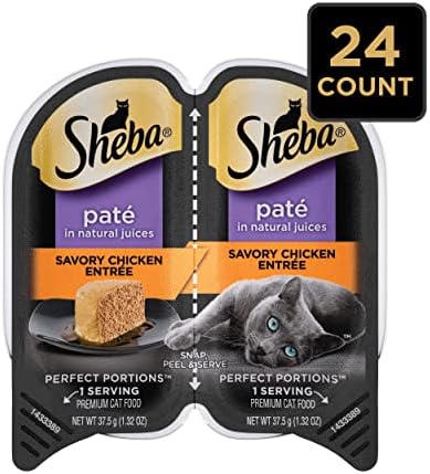 Contains twenty-four (24) 2.6 oz. twin pack trays (48 servings total) of SHEBA PERFECT PORTIONS Paté Wet Cat Food, Savory Chicken Entrée