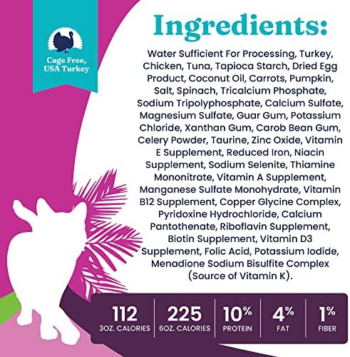 Great Source of Hydration – This grain free wet cat food is a great canned cat food to add essential hydration to your fur baby’s diet, while also adding nutrients through superfoods, like spinach and carrots, and healthy fatty acids with coconut oil
