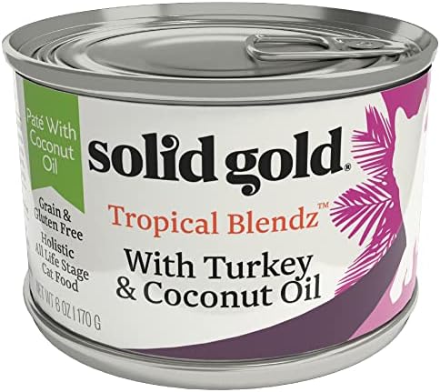 Give your pal the solid nutrition he craves with the Solid Gold Tropical blends with salmon & coconut oil pate grain-free Canned cat food. An exciting new twist to the classic pate kitties love, itβs made with salmon as the top ingredient, plus wholesome veggies like carrots, pumpkin and fiber-rich spinach, and all the goodness of coconut oil. Coconut oil is a great source of medium-chain fatty acids that support Energy and skin and coat health. With no grains or gluten and enhanced with taurine, vitamins and minerals, It provides a holistically formulated and complete diet for cats of all ages, from Cute kittens to wise seniors!