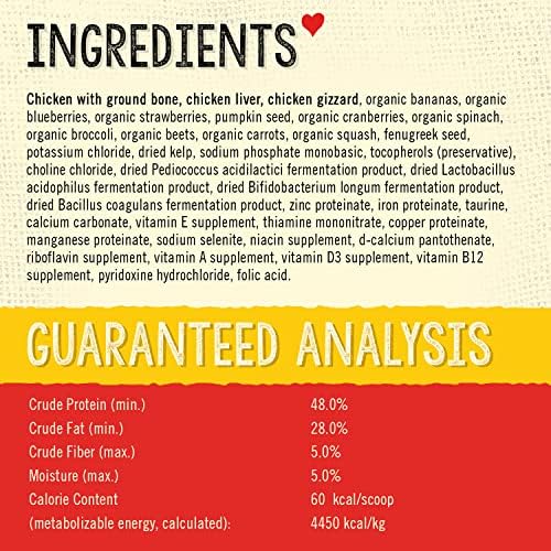 Stella & Chewy’s Meal SuperBlends feature raw, freeze-dried nutrient-rich meat, organs, & bones and a custom-blend of organic, freeze-dried superfoods, including bananas, blueberries, and strawberries. The Cage-Free Chicken Recipe is crafted in our own USA kitchen with the world’s finest ingredients. Size: 8 oz pouch. Ingredients: Chicken with ground bone, chicken liver, chicken gizzard, organic bananas, organic wild blueberries, organic strawberries, pumpkin seed, potassium chloride, organic cranberries, organic spinach, organic broccoli, organic beets, sodium phosphate monobasic, organic carrots, organic squash, organic apples, choline chloride, dried Pediococcus acidilactici fermentation product, dried Lactobacillus acidophilus fermentation product, dried Bifidobacterium longum fermentation product, tocopherols (preservative), calcium carbonate, zinc proteinate, zinc sulfate, iron sulfate, iron proteinate, vitamin E supplement, niacin, copper sulfate, copper proteinate, manganese sulfate, sodium selenite, manganese proteinate, thiamin mononitrate, pyridoxine hydrochloride, vitamin D3 supplement, folic acid, calcium iodate, vitamin B12 supplement