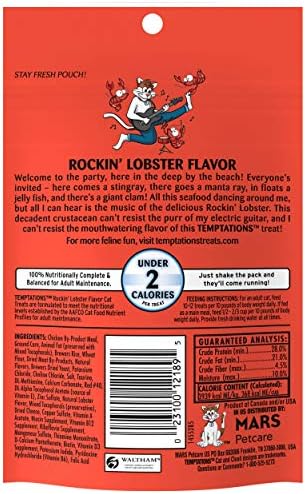 Cats can’t resist the delectable taste of TEMPTATIONS, so give your cat these purrfect TEMPTATIONS Classic Cat Treats… they’ll come running the moment you open the tub. Each of these low calorie lobster flavor cat snacks has less than 2 calories and provides an irresistible combination of both crunchy and soft textures. These healthy cat treats also come in a cat-proof, stay-fresh pouch, so your feline friend can enjoy their favorite snack when you open it, but never when they shouldn’t! These TEMPTATIONS Classic Cat Treats are a perfect addition to your cat’s normal feeding routine: Use them as a treat, a meal, or a cat food topper. They also are the perfect size treats for cat toys… try mixing up playtime by placing a few inside a treat dispensing toy and watch your cat chase and swat away. * Based on 2020 Nielsen sales data
