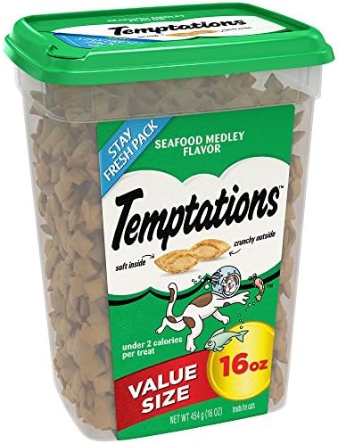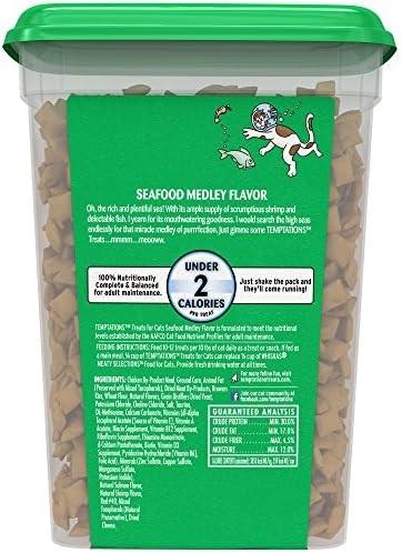 Pet parents know texture is just as important as taste for their cat. TEMPTATIONS Treats for Cats Seafood Medley Flavor features a unique pocket shape that is delightfully crunchy on the outside and scrumptiously soft and creamy on the inside. Your feline friend will adore the natural, savory seafood taste, which never contains artificial flavors. America’s #1 cat treat* is also 100% nutritionally complete and balanced for adult cat maintenance. You will love that your cat is getting great-tasting nutrition, and at only 2 calories per treat, our delicious cat treats are perfect for playtime, snack time or anytime. (*Based on sales data)