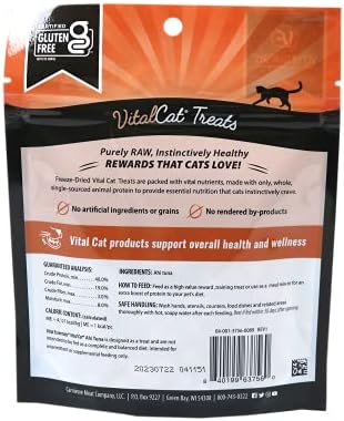 Vital Essentials Vital Cat Ahi Tuna Freeze-Dried Cat Treats are made from pure, raw Ahi Tuna. We do not add fillers, flavoring or rendered by-products. Single ingredient, high protein cat treats support your catβs health, naturally. Freeze-dried Ahi Tuna treats will quickly rise to the top of your cat’s list. Cats love the taste because we use a 48-hour slow freeze-drying process that locks in the natural flavor, texture and freshness of the Ahi Tuna without compromising the nutritional value. A healthy, nutritious and delicious way to feed your cat between meals. Treats with real Ahi Tuna your cat instinctively craves. INGREDIENTS: Ahi Tuna, CALORIE CONTENT: 117 kcal/oz, GUARANTEED ANALYSIS: Crude Protein – Min. 40.0%, Crude Fat – Min. 19.0%, Crude Fiber – Max. 3.0%, Moisture – Max. 8.0%. Certified gluten free certificate ID 68908 issued by GFCO on 2/4/19.