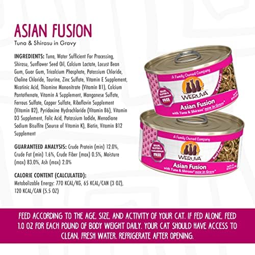 Awesome Happy, Awesome Healthy. We hope your furry friends love Weruva as much as our own pets! Mackerel Flakes, Water Sufficient For Processing, Calamari, Shrimp, Mussel, Sunflower Seed Oil, Locust Bean, Carrageenan, Dicalcium Phosphate, Guar Gum, Choline Chloride, Taurine, Vitamin E Supplement, Zinc Sulfate, Thiamine Mononitrate (Vitamin B1), Nicotinic Acid (Vitamin B3), Ferrous Sulfate, Calcium Pantothenate, Vitamin A Supplement, Potassium Iodide, Manganese Sulfate, Vitamin D3 Supplement, Copper Sulfate, Riboflavin Supplement (Vitamin B2), Pyridoxine Hydrochloride (Vitamin B6), Folic Acid, Menadione Sodium Bisulfite Complex (Source of Vitamin K), Vitamin B12 Supplement Tuna Red Meat, Water Sufficient For Processing, Shirasu, Vegetable Gums (Locust Bean, Guar, Carrageenan), Sunflower Seed Oil, Dicalcium Phosphate, Choline Chloride, Taurine, Vitamin E Supplement, Zinc Sulfate, Thiamine Mononitrate (Vitamin B1), Nicotinic Acid (Vitamin B3), Ferrous Sulfate, Calcium Pantothenate, Vitamin A Supplement, Potassium Iodide, Manganese Sulfate, Vitamin D3 Supplement, Copper Sulfate, Riboflavin Supplement (Vitamin B2), Pyridoxine Hydrochloride (Vitamin B6), Folic Acid, Menadione Sodium Bisulfite Complex (Source of Vitamin K), Vitamin B12 Supplement Crude Protein (min) 12%, Crude Fat (min) 1.6%, Crude Fiber (max) 0.5%, Moisture (max) 83%, Ash (max) 2.0%, Taurine (min) 0.05%, Calcium (max) 0.25%, Phosphorus (max) 0.20%, Magnesium (max) 0.024% Crude Protein (min) 12%, Crude Fat (min) 1.6%, Crude Fiber (max) 0.5%, Moisture (max) 83%, Ash (max) 2.0%, Taurine (min) 0.05%, Calcium (max) 0.28%, Phosphorus (max) 0.23%, Magnesium (max) 0.024% Feed according to the age, size & activity of your cat. If fed alone, feed 1.0oz for each pound of bodyweight daily, best fed twice a day. Your cat should have access to clean, fresh water. Refrigerate after opening Feed according to the age, size & activity of your cat. If fed alone, feed 1.0oz for each pound of bodyweight daily, best fed twice a day. Your cat should have access to clean, fresh water. Refrigerate after opening This cat food is formulated to meet nutritional levels established by the AAFCO cat food nutrient profiles for adult maintenance This cat food is formulated to meet nutritional levels established by the AAFCO cat food nutrient profiles for adult maintenance