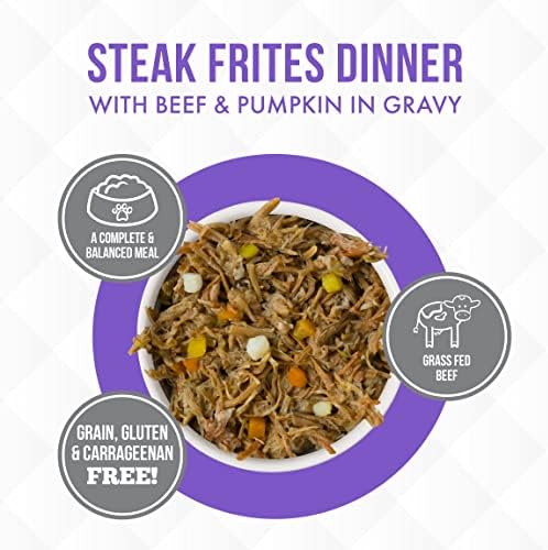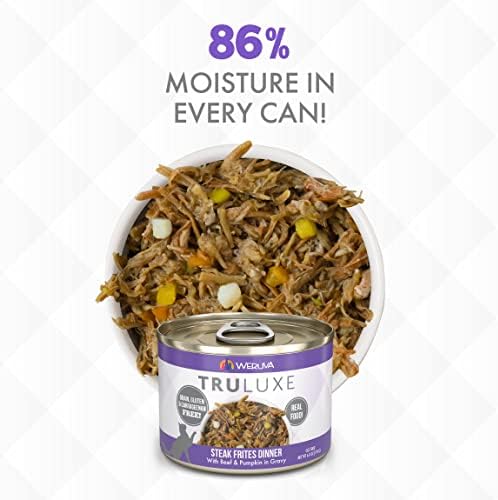 Meet Weruva: Weruva was founded over ten year’s ago by David & Stacie Forman and is still proud be family owned and operated. WeRuVa was inspired by and named after the founder’s three rescued cats; Webster, Rudi and Vanessa. With the search for “The Best Cat Food Under the Sun” never seeming to end, David & Stacie thought, “Let’s give it a shot ourselves ” and gathered the best ingredients from around the world, formulated some fantastic recipes and created Weruva. Naturally, when they were lucky enough to have their rescued dog Baron enter the family, they decided to expand our products to include dog food. Our desire for more innovative, healthy pet products could not be stopped and we continued to dream up and produce some of the best products for pets and their people. Today, we have expanded our product offerings to include four cat wet food brands, two dog wet food brands, dry dog food, treats, pumpkin supplements and even litter! Quality Control, Safety & Ingredients: Weruva always strives to be more than just a pet food company. We are obsessive over Safety and Quality Control and only produce our products in BRC/USDA Approved Facilities; arguably the highest standards for human-food production. We also source responsible and sustainable raw materials. You will be happy to know Weruva uses Cage-Free Chickens, Grass-Fed Beef & Lamb, and Wild-Caught Fish. Did we mention everything is GMO-Free? Learn about TruLuxe Grain-Free: Weruva’s TruLuxe cat food is the newest to our family of brands,consisting of five of Weruva’s original, old-time favorites as well as five new and exciting formulas. This line features formulas with unique and delectable fish like Basa, Saba and Pink Salmon. You will also find formulas with grass-fed Australian Beef, grass-fed New Zealand Lamb and cage-free Turkey. Let your cat indulge in these highly palatable and unique offerings that are all made in a facility that also makes people food! What is Steak Frites? For all you French lovers out there . even the finickiest of cats don’t turn their nose up at this grass fed beef treat . mixed with hearty sweet potatoes and pumpkin . chez magnifique!Guaranteed Analysis:Protein (min) 10%, Fat (min) 1.3%, Fiber (max) 0.5%, Moisture (max) 86.0%, Ash (max) 2.0%, Taurine (min) 0.05%.AAFCO Statement:This cat food is formulated to meet nutritional levels established by the AAFCO cat food nutrient profiles for adult maintenance.